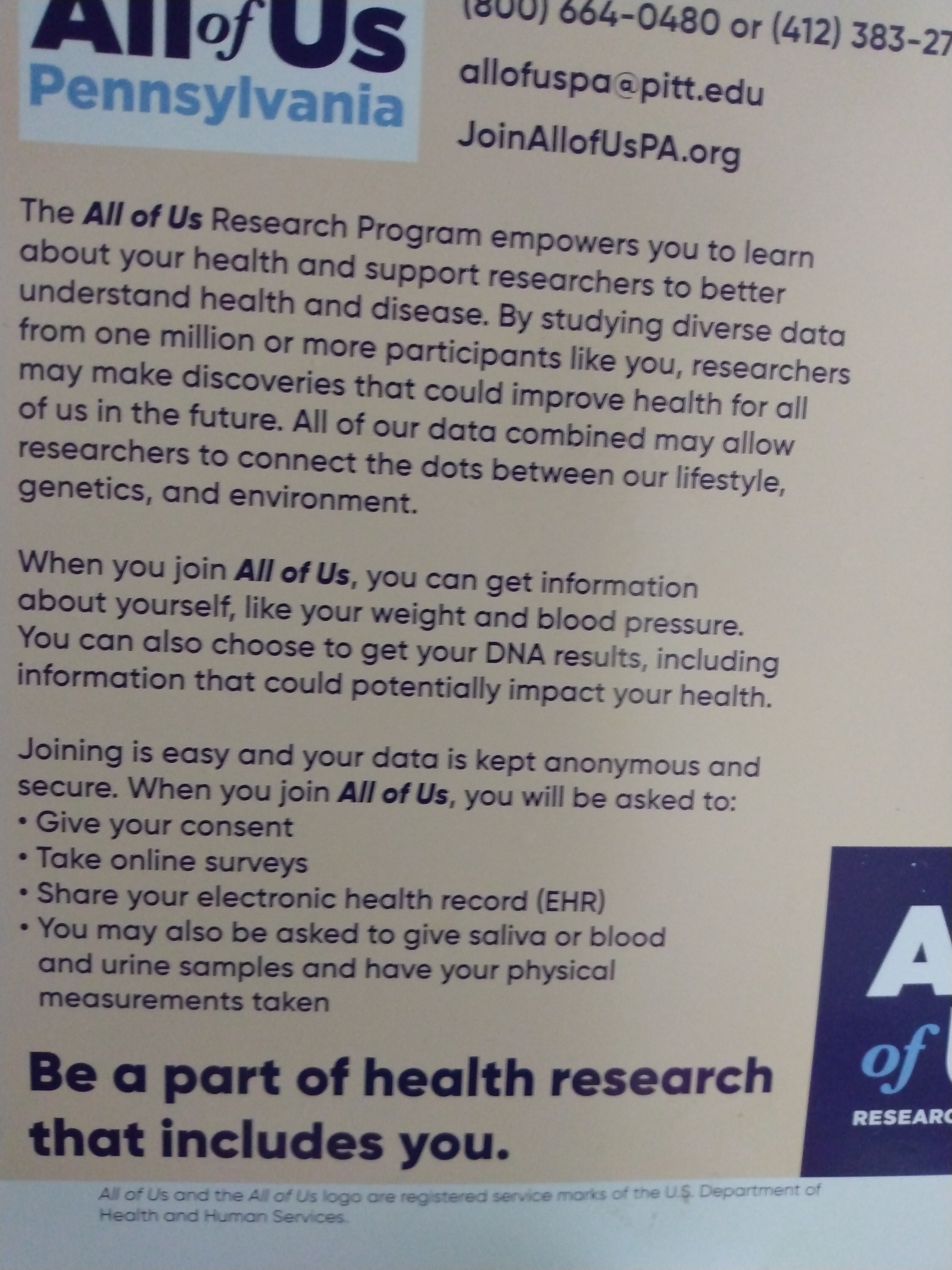 DNA, Health Records, Blood, saliva, urine…and oh yah, it is all kept private says the government funded school working for the government health agency.