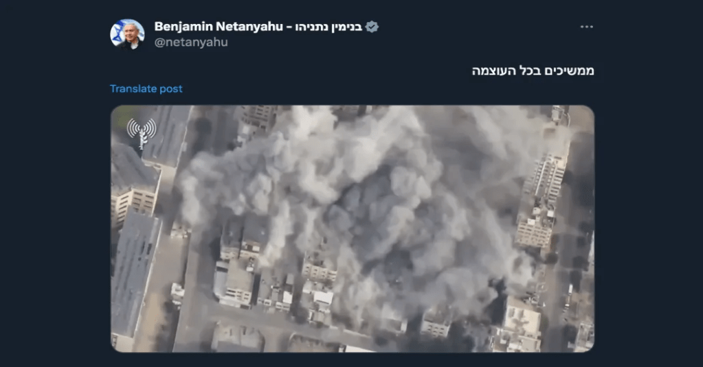 Israel has used White Phosphorus on the people in Gaza, another war crime. Israel has given all people in north Gaza, 1.1 million human beings, 24 hours to move to south Gaza. That is impossible and will not happen. It is an attempt of ethnic cleansing.