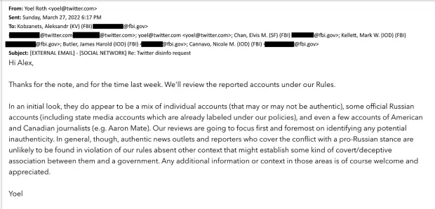 In response, Yoel Roth, Twitter’s then-Head of Trust and Safety, informed Special Agent Kobzanets and his FBI colleagues that Twitter would “review the reported accounts under our Rules.” But he warned that the list included “a few accounts of American and Canadian journalists (e.g. Aaron Mate).” Therefore, Roth said, Twitter’s review would “focus first and foremost on identifying any potential inauthenticity.”